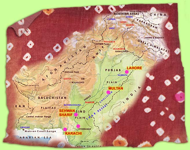 | The places we visited are highlighted and marked by a pink spot on the above map. The font size bears no relation to the actual size of the localities. While Karachi, Multan and Lahore are big cities with millions of inhabitants, Sehwan Sharif is just a sleepy small place. You can enter the pages of those four locations directly through the pink spots, or through the menue on the left. Hyderabad has no entrance of its own. | ||||
